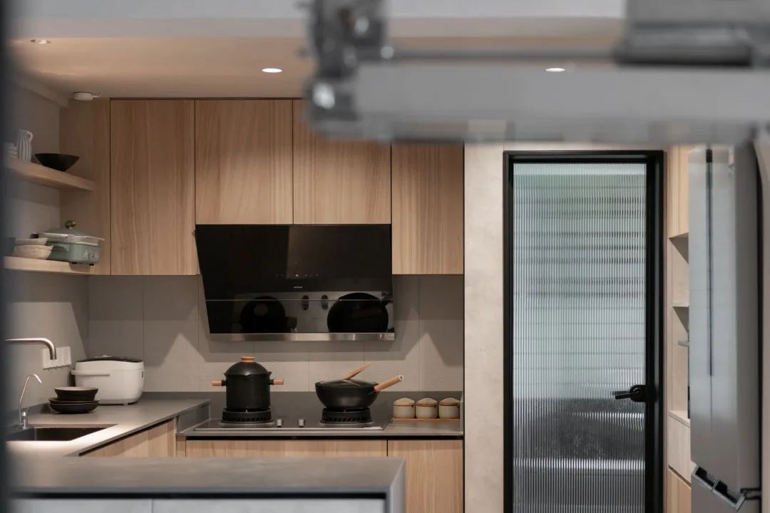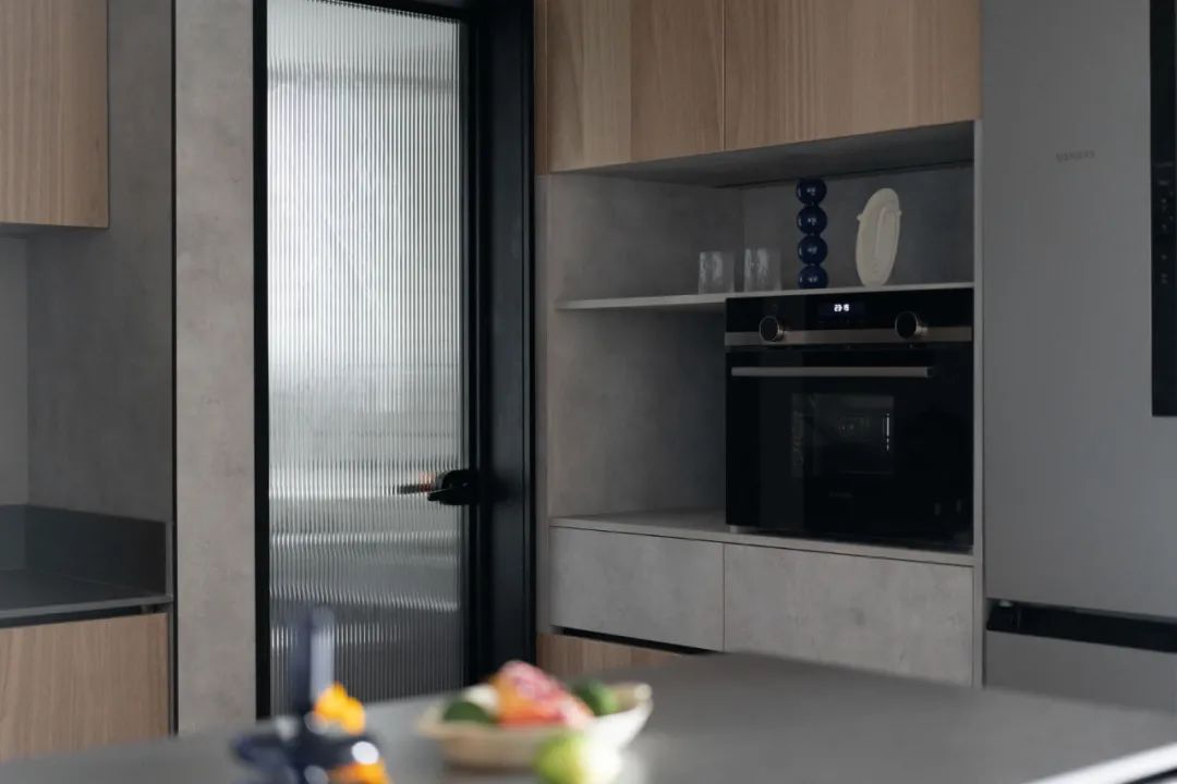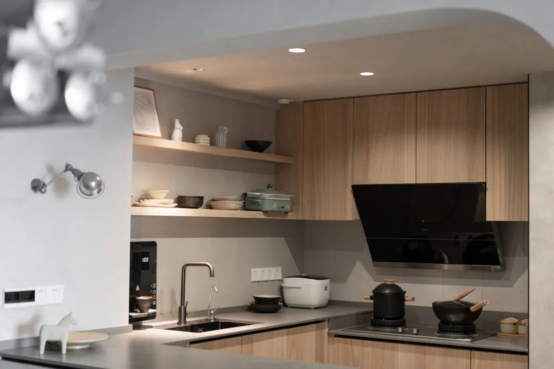 這套新房南北通透,客廳跟陽臺都有獨立的陽臺,能保證室內的采光還有通風。餐廳的空間不大,如果要布置家具的話,菱形的餐桌會是首選。在左邊靠近廚房的墻面,打造了一個嵌入式的柜子,能增加收納的空間,中間預留的地方可以用來放裝飾品,也能用來放平時常用的東西。