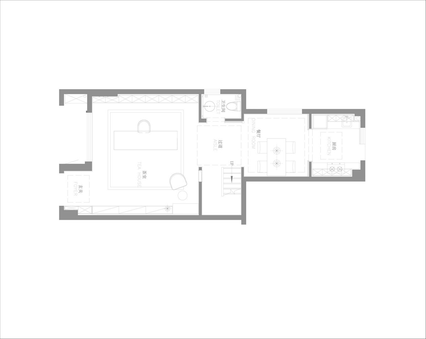 延續(xù)格子窗語(yǔ)匯玻璃門帶過廚房空間,整合了客、餐廳風(fēng)格。