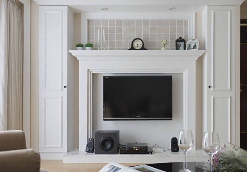 客廳電視主墻處,壁爐是英式與美式風(fēng)格中不可或缺的元素,灰白色復(fù)古磚拼接展現(xiàn)了屋主淡雅自然性格,兩側(cè)對(duì)稱性的線條界定,收住了飽滿收納。