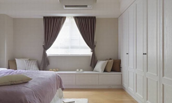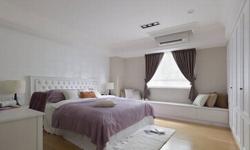 白色及美式風(fēng)格延伸來到主臥房空間,在不動(dòng)格局的考量下,設(shè)計(jì)師利用床尾衣柜及窗邊平檯滿足了收納,拉出一進(jìn)門的步伐景深。