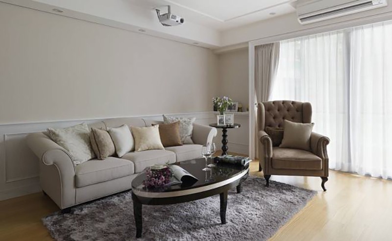 為了修飾社區(qū)中鋁框的不協(xié)調(diào),利用白色古典窗框佐以經(jīng)典白紗與窗簾,完整客廳古典情調(diào)。