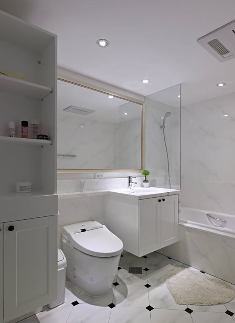 衛(wèi)浴部份黑白磁磚交貼與不落地浴柜設(shè)計(jì),連衛(wèi)浴都有了美好比例。
